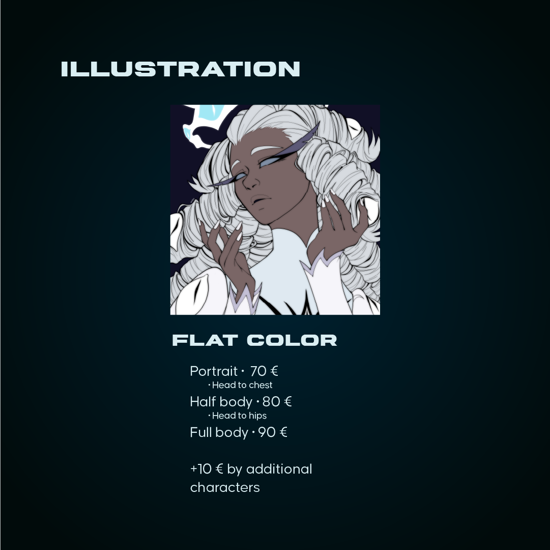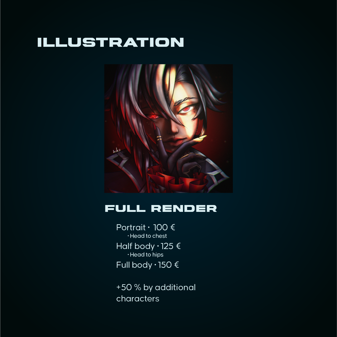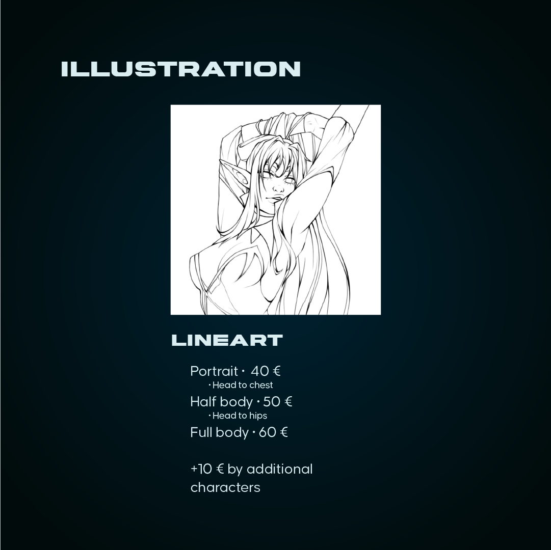 If the commissioned piece is intended for commercial use, the client needs to purchase the commercial rights in order to use the artwork. The commercial rights will be up to 200% of the commission original price. Buying commercial rights allows you to make merch with the artwork, like books, covers, use it as Props, change it to your liking and promote your own brand with it. Credit is still required for usage of the arwork.