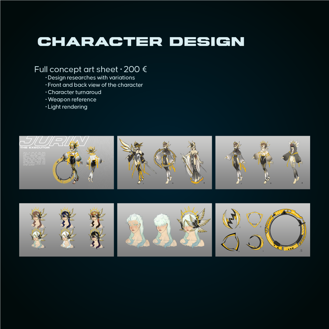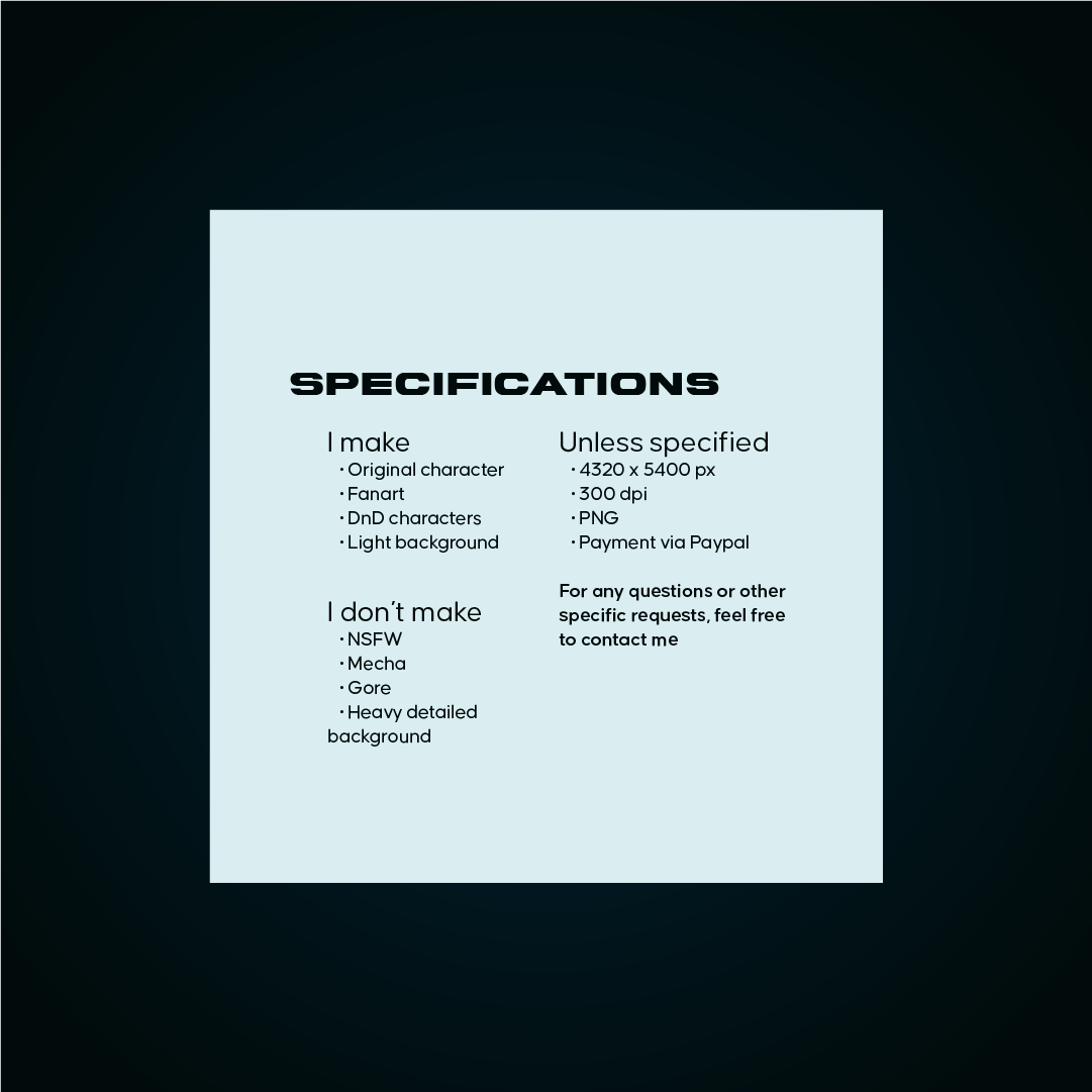 Before begging anything, I will ask the client questions about the commission and any references I may need to create the artwork. Any change in the design must be requested during the sketch stage, once the sketch is approved by client additional changes will cost extra (color not included in the extra).